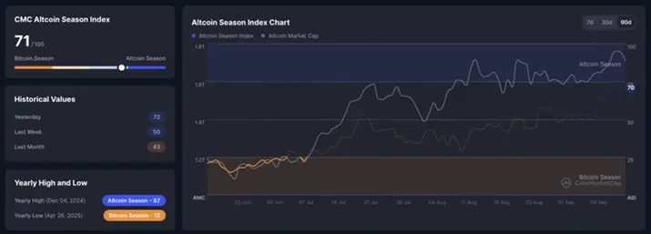 Индекс сезона альткоинов достиг 71 пункта, а общая капитализация альткоин-рынка составила $1,73 трлн — оба показателя стали максимальными за последние несколько месяцев, обратили внимание эксперты QCP Capital.