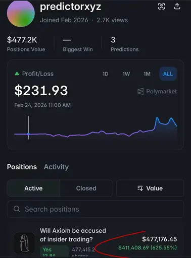 Позже стало известно, что Бауэр сделал ставку размером $60 000 на платформе предсказаний Polymarket, предположив, что ZachXBT обвинит Axiom в инсайдерской торговле. После публикации расследования ставка была рассчитана, и прибыль за несколько минут достигла $400 000.