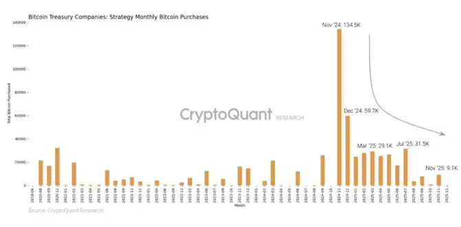 Покупки криптовалюты Strategy сократились со 134 000 BTC в ноябре 2024 года до 9100 BTC в ноябре 2025 года. Компания теперь держит не только биткоины, но и доллары США, и допускает хеджирование и выборочную монетизацию в стрессовых рыночных условиях.