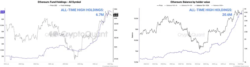 Специалисты указали, что крупные фонды удвоили свои резервы с апреля, доведя их до 6,5 млн ETH, тогда как киты с балансами от 10 000 до 100 000 ETH теперь контролируют свыше 20 млн ETH.