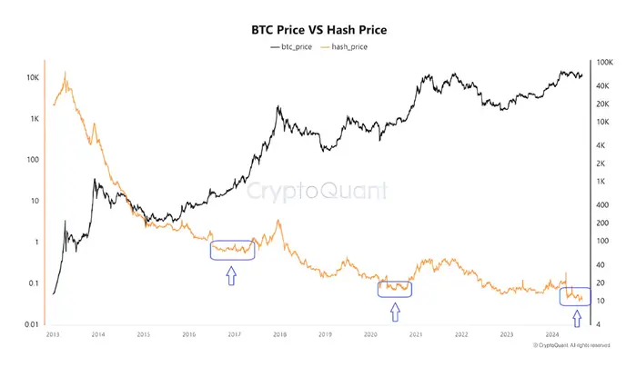 По их наблюдения, аналогичная ситуация сложилась после обвала рынка в марте 2020 года, и тогда низкий хешпрайс сохранялся вплоть до халвинга биткоина, после чего начался стремительный рост стоимости первой криптовалюты.