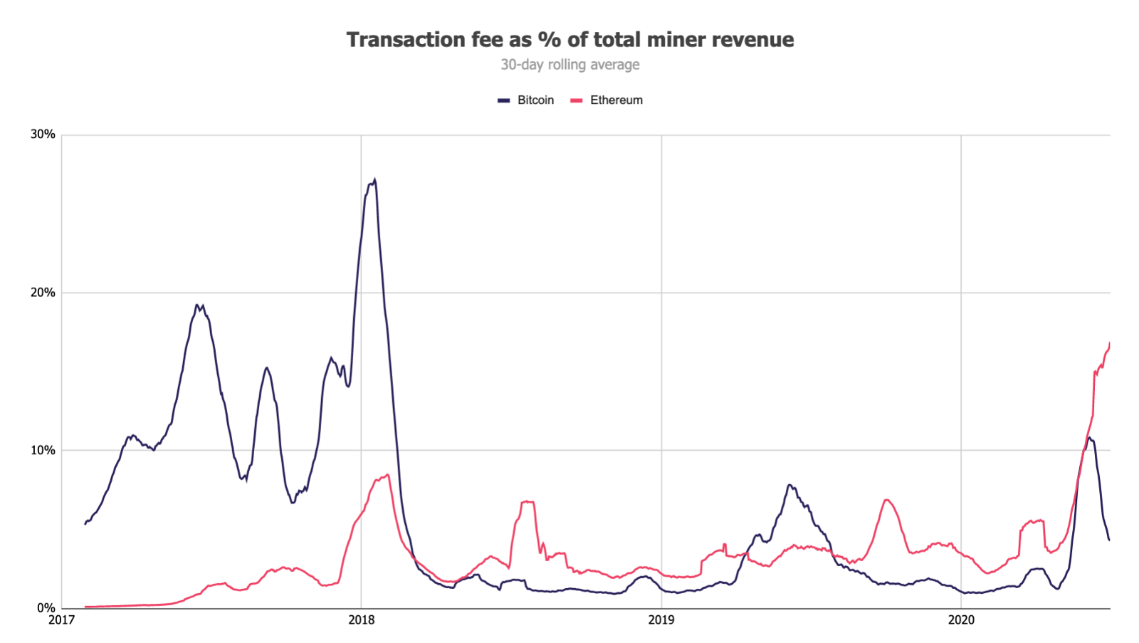 Обычно майнеры криптовалют получают доход с наград за добычу блока и с комиссий за обработку транзакций. Увеличение доли дохода с комиссий, скорее всего, частично связано с работой нескольких мошеннических пирамид и схем, которые генерировали большое количество транзакций. Также на увеличение комиссий повлияло увеличение популярности проектов в сфере децентрализованного финансирования (DeFi).