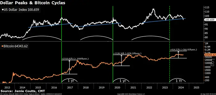 Джейми Коуттс (Jamie Coutts) считает, что биткоин уже вплотную приблизился к так называемой банановой зоне, то есть состоянию эйфории. Эксперт обратил внимание, что в прошлых двух бычьих циклах первая криптовалюта обновляла исторический максимум в течение года после прохождения пика индекса доллара США.
