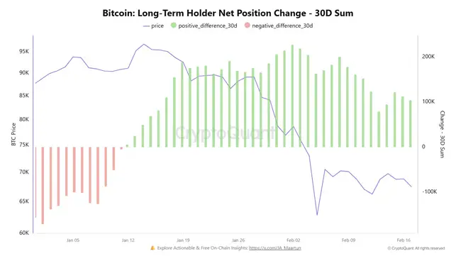 По его оценке, перелом произошел в середине января, когда курс биткоина закрепился в диапазоне $62 000–68 000. С начала года объем накоплений со стороны долгосрочных держателей увеличился примерно на 115 000 BTC, а давление продаж заметно снизилось.
