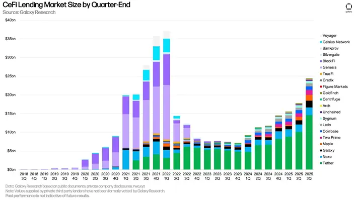Ранее на рынке криптокредитования доминирующие позиции занимали компании, среди которых Genesis, BlockFi, Celsius и Voyager, ставшие жертвами краха криптобиржи FTX в ноябре 2022 года. На данный момент сохранившие устойчивость компании приняли более строгие меры контроля рисков, стандарты полного обеспечения и большую прозрачность для выхода на публичные рынки и привлечения институционального капитала, резюмировали в Galaxy.