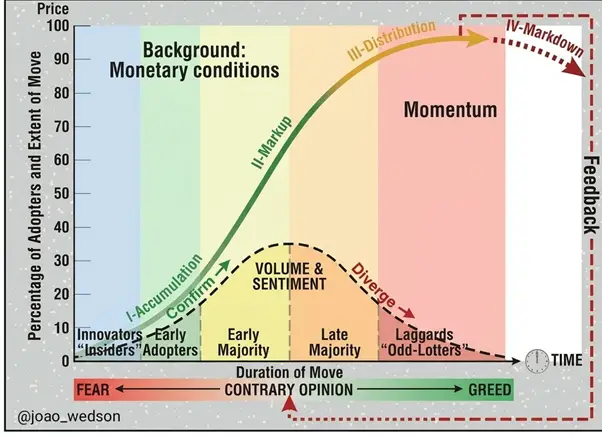 Ведсон отметил, что крипторынок проходит очередной этап снижения доверия к активам. Он выделил четыре стадии рыночного цикла: