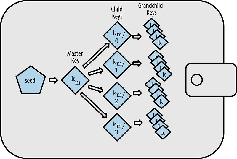 У пользователя HD wallet есть один программный кошелёк с одним секретным ключом. Его также называют "мастер-ключ", или "семя". Объединив тем или иным образом "мастер-ключ" с хэш-функциями, мы получим неограниченное количество связанных друг с другом адресов, причём эта связь не видна посторонним. Мы называем эти новые адреса Bitcoin "дочерними адресами".