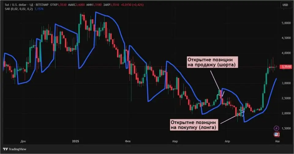 Для наглядности рассмотрим пример. Возьмем дневной график Sui и применим к нему Parabolic SAR. Индикатор будет обозначен синей линией. Рассмотрим ситуацию, которая складывалась на графике с конца марта по апрель 2025 года. 29 марта индикатор поднялся выше цены, что стало поводом для открытия коротких позиций. 11 апреля произошло обратное событие. В этот день цена поднялась выше Parabolic SAR, что возвестило о начале бычьего тренда, который продолжается по сей день: