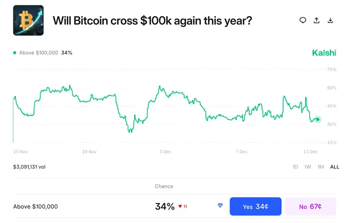 Согласно данным, предоставленным платформой Kalshi, трейдеры и инвесторы закладывают примерно 34% вероятности на то, что первая криптовалюта сможет преодолеть $100 000 к концу года. Участники Polymarket дают всего 29% на достижение этой отметки до 31 декабря.