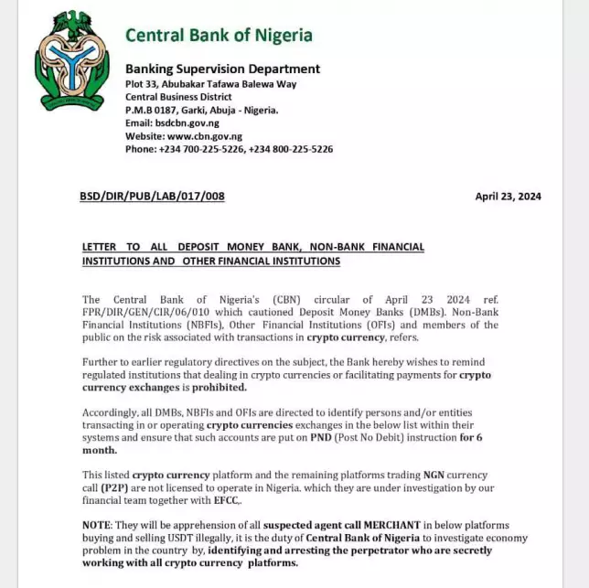 Сообщение разошлось по миру в среду, 24 апреля. От имени CBN было объявлено, что биржи Bybit, KuCoin, OKX и Binance не имеют официального статуса поставщиков виртуальных активов и лицензии на операции в Нигерии. И поэтому всем организациям и физическим лицам, ранее имеющим аккаунты на биржах Bybit, KuCoin, OKX и Binance, заблокируют банковские счета. Владельцам заблокированных счетов будет запрещено совершать любые дебетовые операции, то есть снимать наличные или совершать платежи.