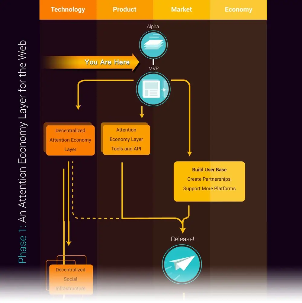 Дорожная карта проекта демонстрирует, как с помощью информации, собранной с помощью Qrator и инструментария Экономики Внимания, Synereo наконец выпустит децентрализованное приложение социальной сети – с уже существующей базой пользователей, их идентификаторами, репутациями и социальными графами, и пользующееся всеми преимуществами технологии блокчейна. Стрелка на дорожной карте показывает текущее состояние проекта: