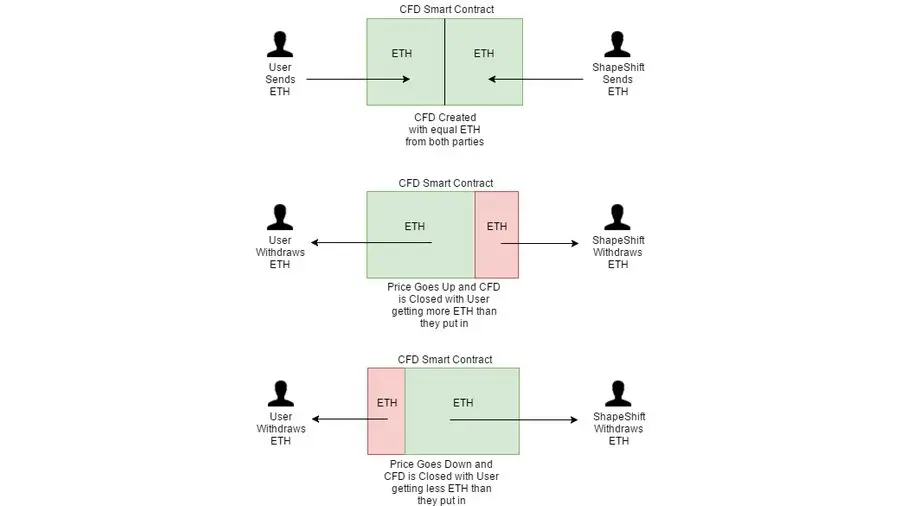 Основа Prism – широко распространенный на финансовом рынке контракт на разницу цен, или CFD, оформленный в виде смарт-контракта Эфириума: два участника делают ставку на будущую цену актива. Они отправляют на смарт-контракт равное количество эфира, а когда наступает срок закрытия Prism, каждый участник может забрать обратно некоторую сумму эфира, размер которой зависит от стоимости залоговых активов на момент закрытия.