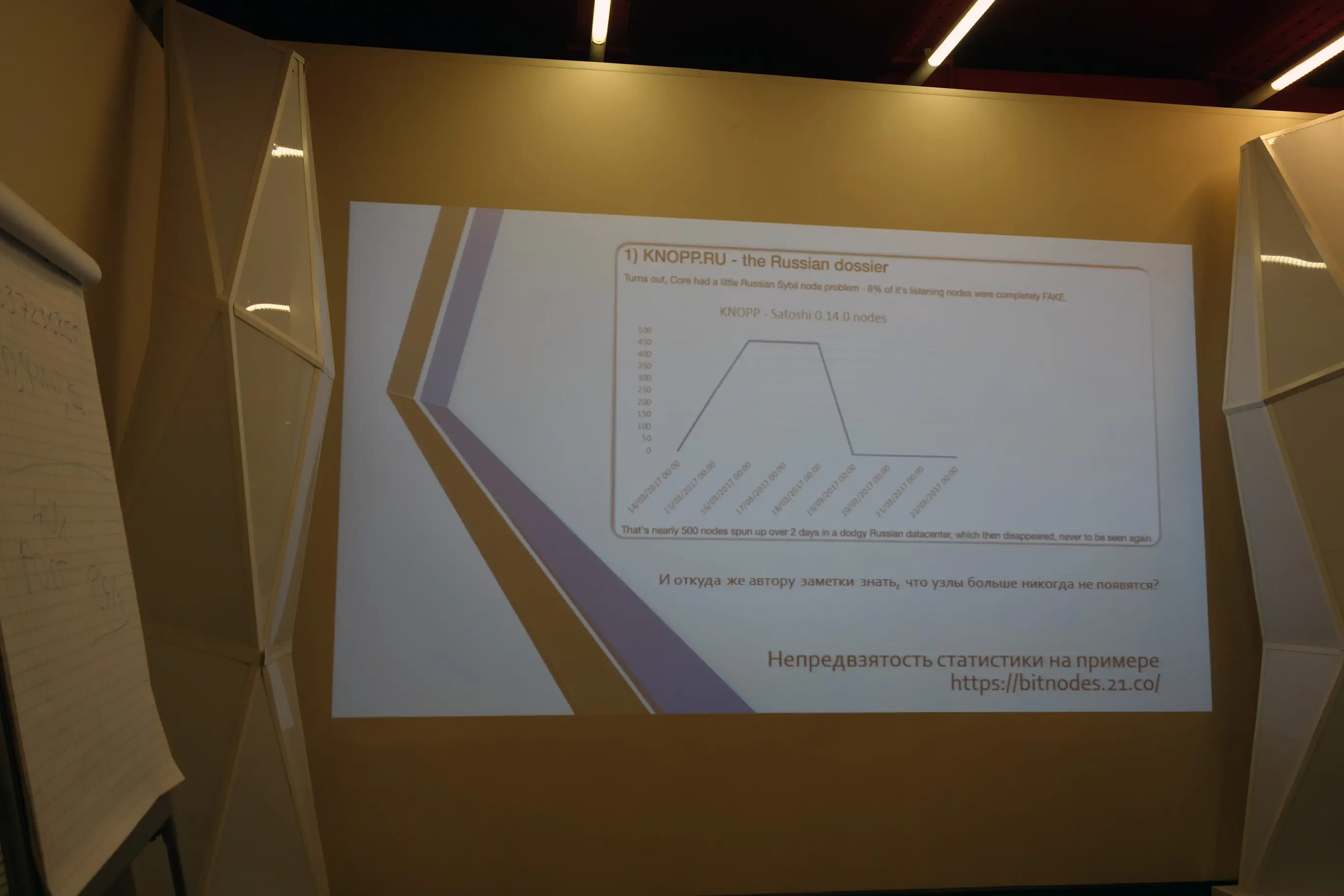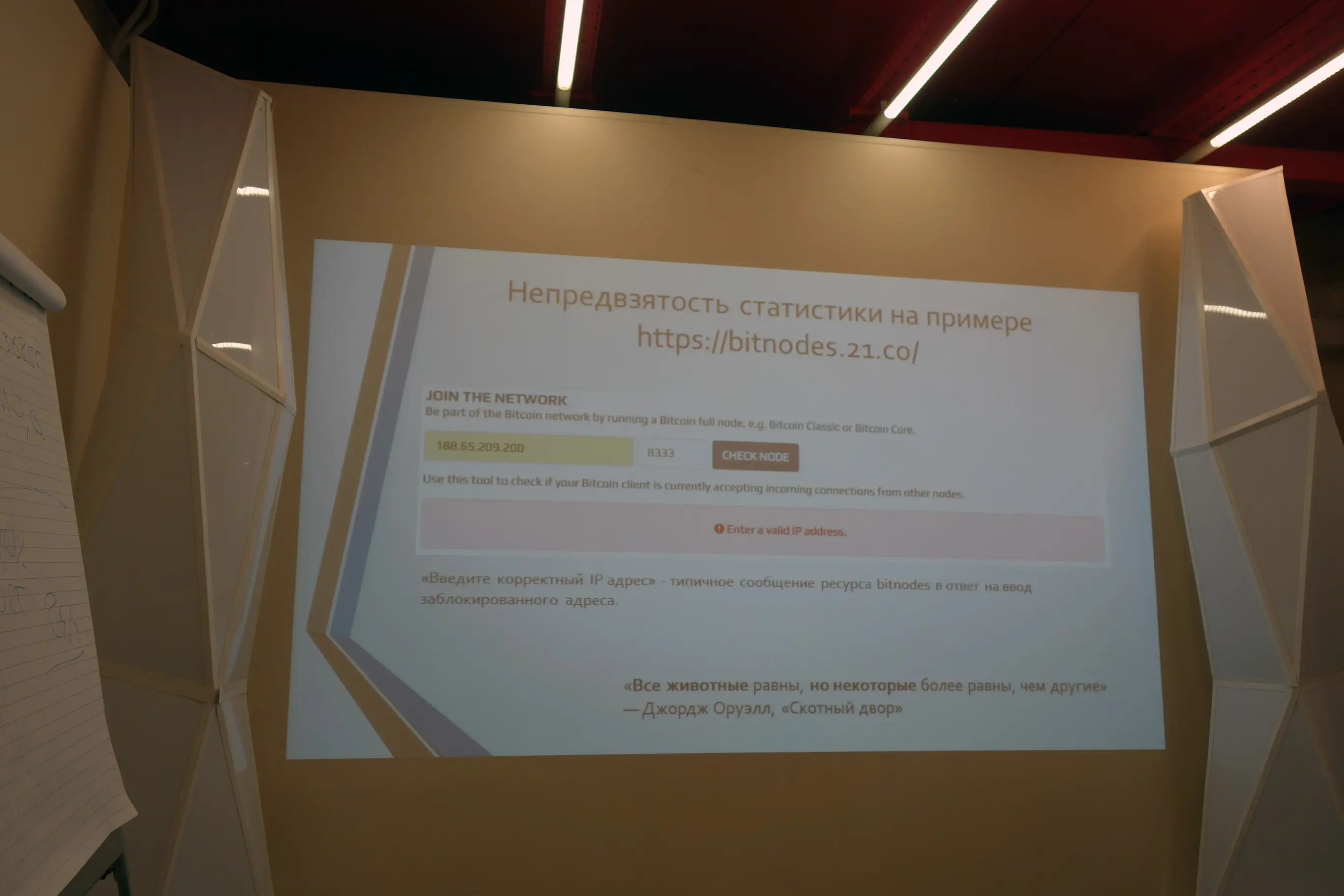 Еще одна особенность, на которую обратил внимание Алексей, это малое количество альтернатив сервисам статистики. К примеру, для увеличения связности сети было поднято около 500 полных узлов в сети в московском дата-центре. Но наиболее авторитетный сайт статистики по узлам bitnodes.21.co решил их не отображать в своей статистике. Более того, даже если запросить вручную проверку узла, сервис возвращал некорректную ошибку, обращение в саппорт также не помогло, то есть это искажение статистики было сделано явно намеренно. Узлы являлись полноценными без каких-либо модификаций. Путем экспериментов было выявлено, что заблокирована вся подсеть дата-центра. Стал ли причиной известный мем про страшных русских хакеров, или сайту выгодно показывать определенные показатели с какой-либо целью - неизвестно.