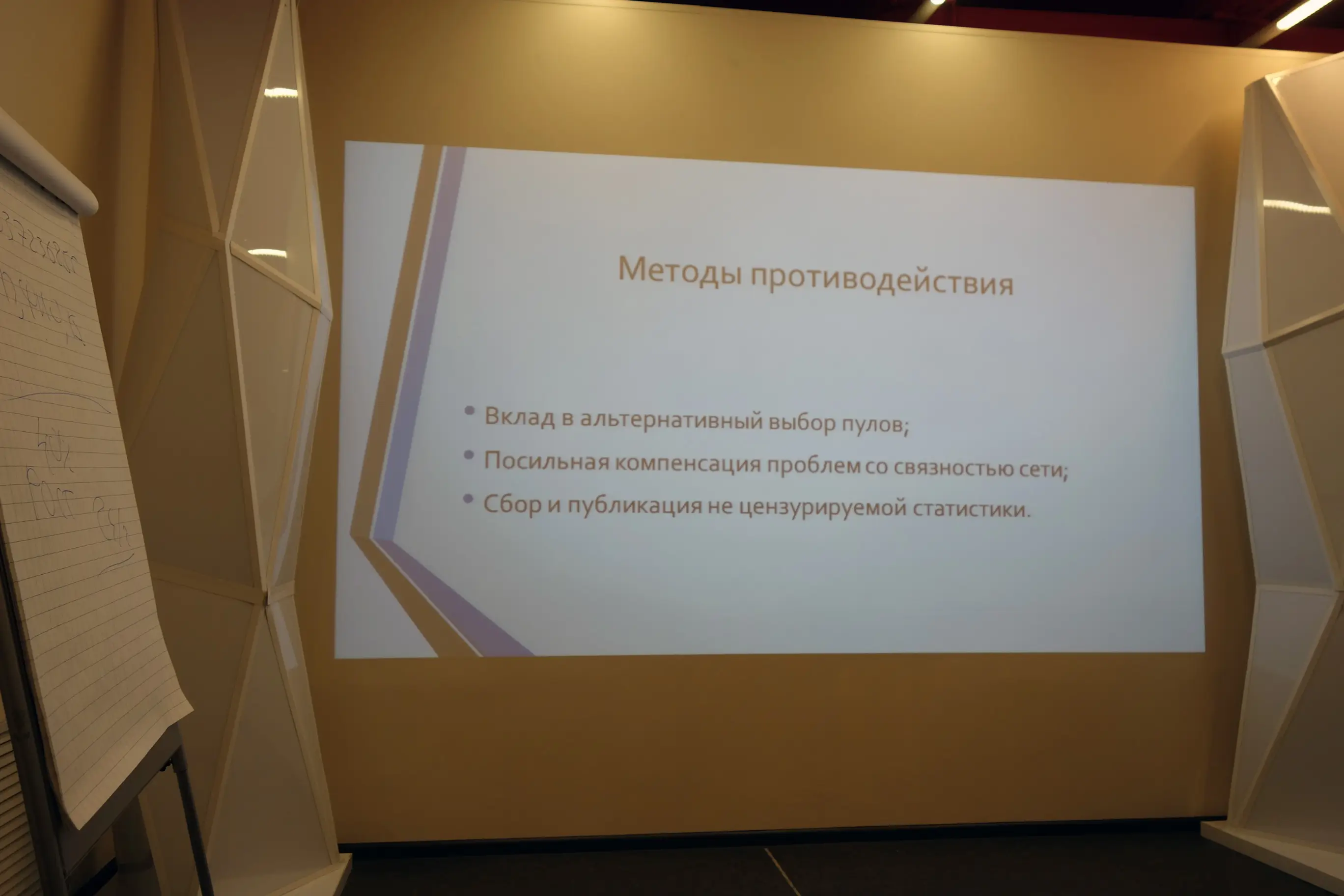 Темой доклада Алексея стали актуальные проблемы развития сети биткоина, централизации и странности в поведении некоторых сервисов статистики.