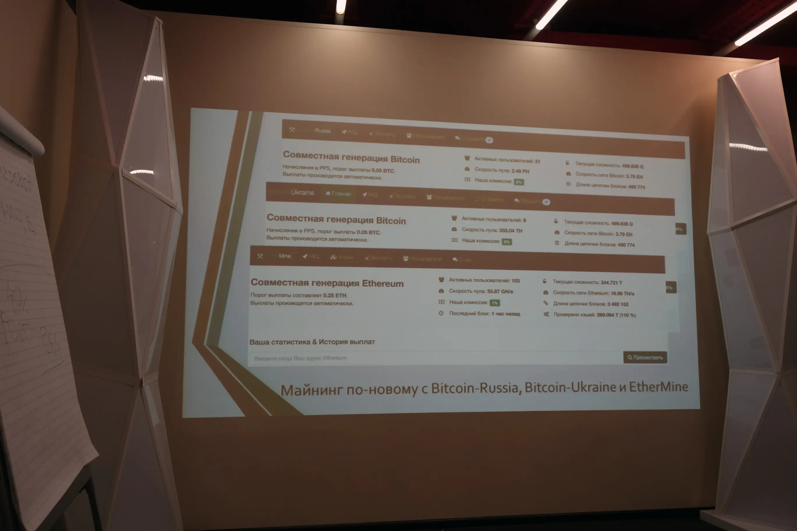 Как решение данной ситуации Алексей предложил поднимать альтернативные сервисы, и сообщил, что от слов они перешли к делу. Не так давно были запущены три пула: Bitcoin-Russia, Bitcoin-Ukraine, EtherMine и сервис статистики по узлам сети Bitcoin nodes.bitcoin-russia.ru