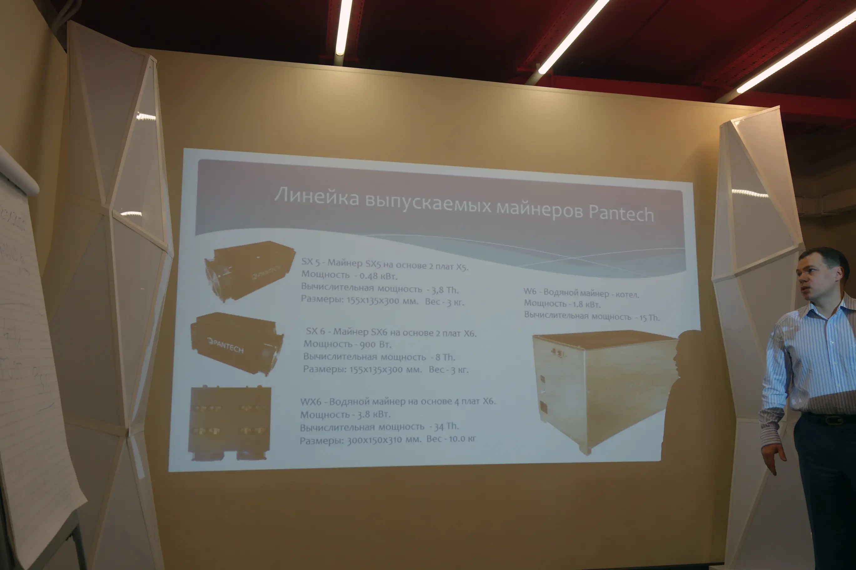 Сергей кратко пояснил азы блокчейна и роль майнеров в экосистеме криптотехнологий, остановившись более подробно на текущей ситуации в области майнинга. Сейчас осталось по сути две крупные компании производителей ASIC майнеров: Bitmain и Bitfury, первая больше ориентирована на розничные продажи, вторая на профессиональных крупных заказчиков. Долю Bitmain Сергей определил как 60-70%, Bitfury 15-20%. При этом именно 16nm чипы Bitfury Сергей считает более энергоэффективными. Ранее они были практически недоступны в розничных решениях. Исправить эту ситуацию взялась корейская компания Pantech, которая выпустила 4 решения: два ASIC майнера с воздушным охлаждением: Pantech SX5 и Pantech SX6, и два майнера с жидкостным охлаждением: Pantech WX6 и Pantech W6, которые являются по сути отопительным оборудованием.