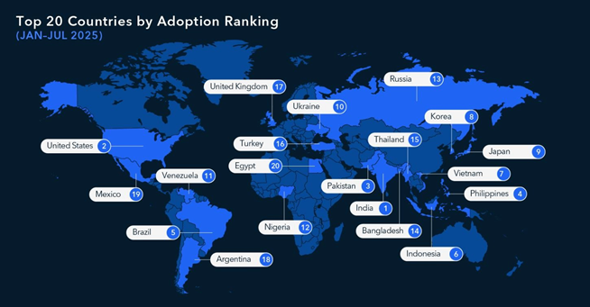 Рейтинг построен на совокупности собственных ончейн-данных TRM Labs, статистики веб-трафика по странам, отражающей активность пользователей, а также показатели работы криптобирж, платежных сервисов и p2p-платформ.