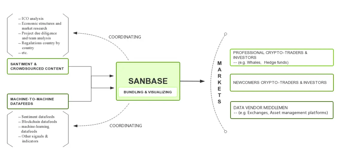 В маркетинговом документе, который команда называет «белой книгой», Santiment описывает три основных элемента своей платформы. Первый – это отредактированный поток данных, включающий в себя анализ краудсейлов, маркетинговые исследования, оценку правовых аспектов и возможные действия регуляторов. Второй элемент – база данных SAN, которая в этом же документе описывается как «открытая база данных с полной информацией о проекте, его основателях и экономической модели», словом, все то, что хотят знать о проекте трейдеры и инвесторы. Контент будет собираться посредством краудсорсинга, «однако, данные будут проверяться кураторами и подтверждаться нашими аналитиками», – говорится далее.