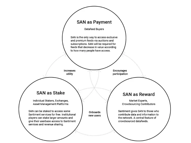 Как и практически любой стартап, Santiment выпускает собственный токен SAN. Он будет использоваться для оплаты премиум-контента и подписок на ленты данных, кроме того, он будет служить залоговым активом для «бесплатного» доступа к службам Santiment, а также в них будет выплачиваться вознаграждение рыночным экспертам.