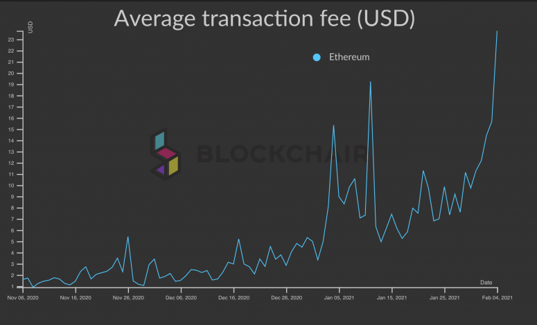 По данным Blockchair, утром 4 февраля средний и медианный размер комиссии за транзакцию в сети Эфириума достиг $23.43 и $11.77 соответственно.