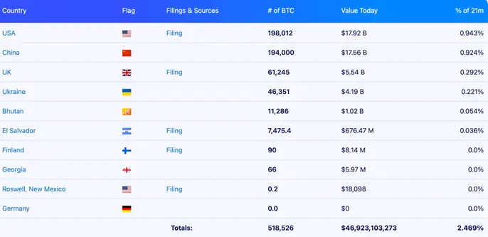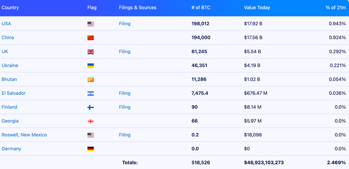 Власти разных стран удерживают 0,6 млн BTC. Лидируют США с 198 012 BTC. На Китай приходится 194 000 BTC. В первую тройку вошла Великобритания, аккумулировавшая 61 245 биткоинов, сообщила Glassnode.