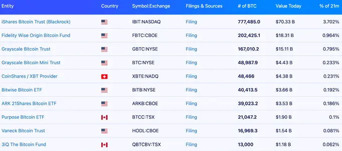Биржевые фонды (ETF) сконцентрировали 1,31 млн BTC. Большая часть предложения находится у iShares Bitcoin Trust управляющей компании BlackRock — 777 485 BTC.