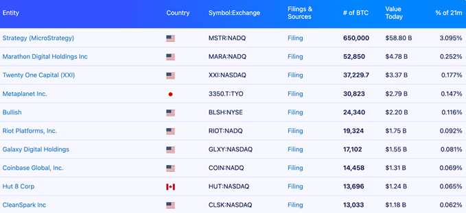 Совокупные запасы всех подобных инвесторов достигли рекордных 5,94 млн BTC. Большая часть криптовалюты удерживается крупными компаниями — 1,07 млн BTC. Первую позицию занимает Strategy, под управлением которой находится 650 000 BTC, это 3% от эмиссии биткоина.