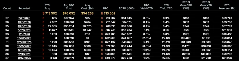 Компания сообщила, что новая партия биткоинов была профинансирована за счет продажи обыкновенных акций MSTR, торгуемых на американской фондовой бирже Nasdaq. Сейчас в распоряжении Strategy находится 713 502 BTC. На формирование этого запаса фирма потратила более $54,26 млрд при средней цене покупки $76 052 за 1 BTC.