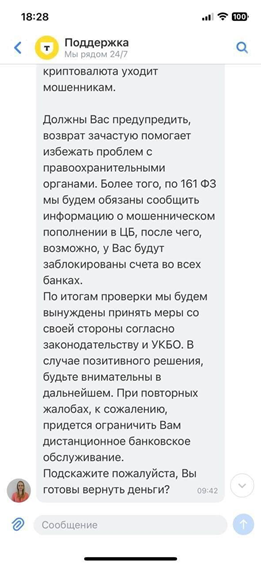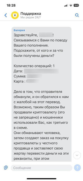 В обращении к клиенту банк отметил, что ему известно о вероятной природе перевода — продаже криптовалюты. Банк обратил внимание пользователя на то, что сделки с криптовалютами не запрещаются. Однако в случае поступления жалобы со стороны отправителя, рекомендуется вернуть средства во избежание обращения в Банк России и блокировки счета.