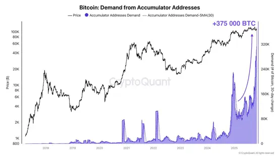 «Несмотря на то, что общий спрос немного замедлился, для данной категории инвесторов это не так. Менее чем за два месяца их среднемесячная покупательская активность более чем удвоилась — со 130 000 до 262 000 BTC, что демонстрирует ускорение тренда».