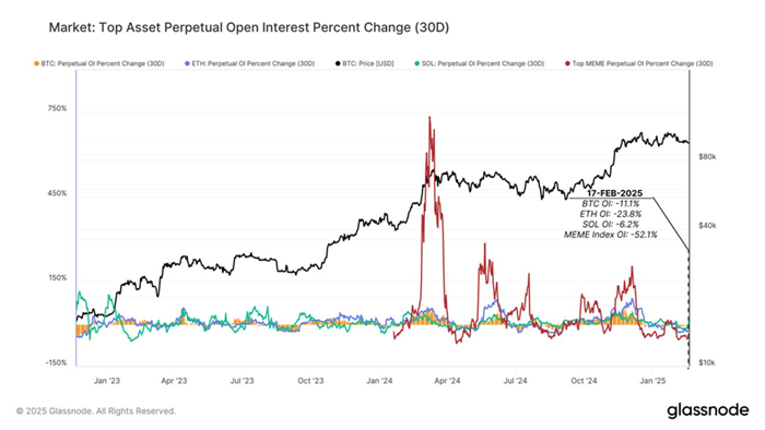 Аналитики рассказали, что за последние недели снизился приток в крупнейшие активы, а эфир и мемкоины зафиксировали чистый отток капитала. Спекулятивная активность ослабевает — открытый интерес в бессрочных фьючерсах снизился более чем на 11% у биткоина, почти на 25% у эфира и на 52% у мемкоинов.