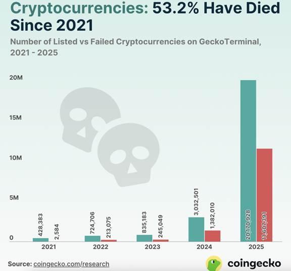 Несмотря на волну неудач, общее число криптопроектов за 2025 год резко выросло. Если в 2021 году на GeckoTerminal было зарегистрировано 428 383 проекта, то к концу 2025-го их число достигло 20,2 млн. Впрочем, большинство проектов не дожило даже до конца года, обратили внимание аналитики.