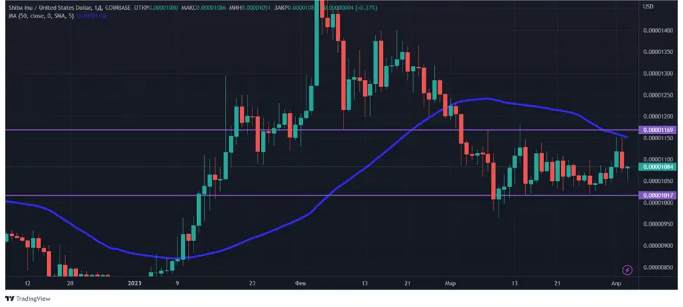 На начало апреле нельзя сказать, что Shiba Inu находится в каком-то тренде. Монетка скорей застряла в боковике между уровнями поддержки $0,00001017 и сопротивления $0,00001169. Если удастся преодолеть первый из них вниз или второй вверх, то можно будет говорить о начале какого-то движения. Негатива придает тот факт, что монета торгуется ниже 50-дневного скользящего среднего.