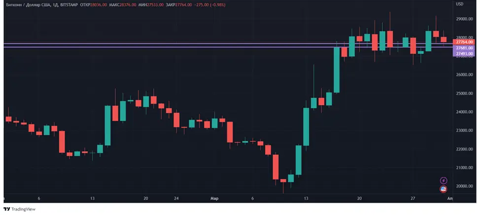 С точки зрения технического анализа биткоин подошел к $29 000, два раза поднимался выше этой отметки и опускался обратно. Это говорит о наличии сильного уровня сопротивления в районе $29 000 – $29 500. Уровень поддержки – минимум этой недели от 27 марта, $26 541.