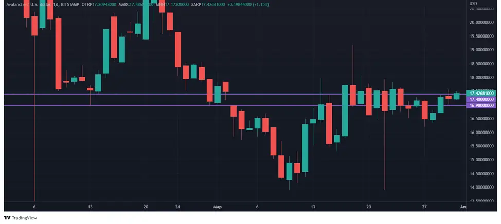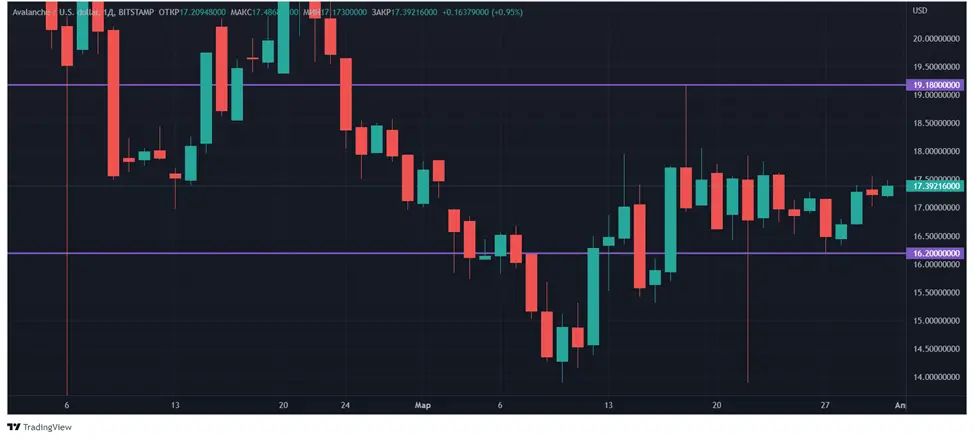 На данный момент цена AVAX находится в боковом движении. Уровнем поддержки выступает отметка в $16,2, уровнем сопротивления – максимум марта 2023 года в $19,18.