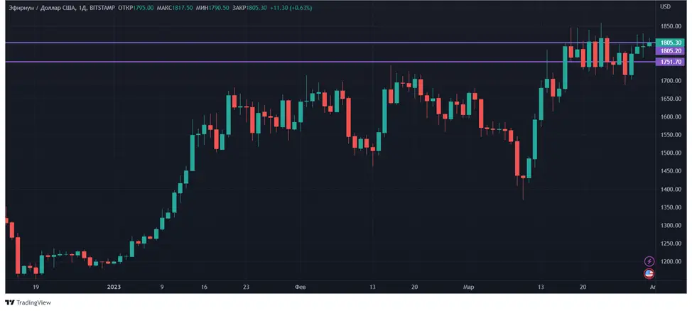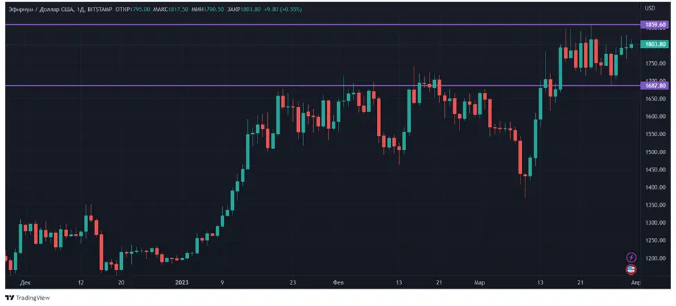 Неделя с 24 по 31 марта ознаменовалась ростом эфира на 3%. При этом четыре последние сессии, начиная со вторника 28 марта, монетка находилась в зеленой зоне. Самым провальным днем на неделе стал понедельник 27 марта, когда эфир упал на 3,34%, а цена опускалась ниже $1 700.