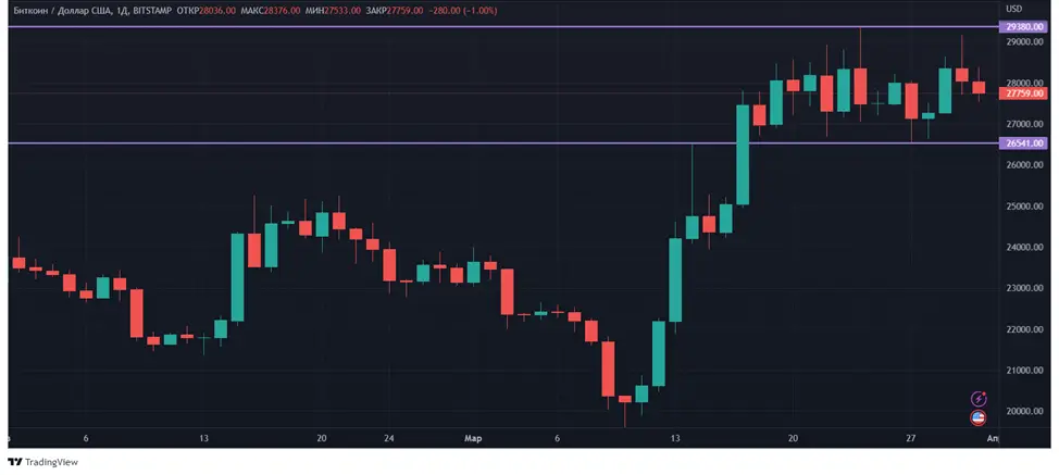 Цена биткоина за последнюю неделю изменилась меньше чем на 1%. За последние семь дней первая криптовалюта мира предпринимала новую попытку закрепиться выше уровня в $29 000, однако торгуется около $28 000 на вечер пятницы, 31 марта.