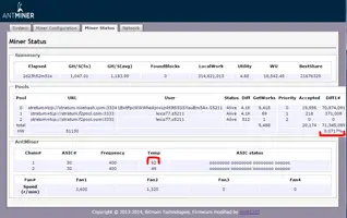На скриншоте отлично видно, что разница температур - запредельная. Процент HW (HardWare Error) в пределах, но высокий, да и хешрейт при таком разгоне просто никакой. Красным отмечена та плата, которая и подвергнется моддингу.